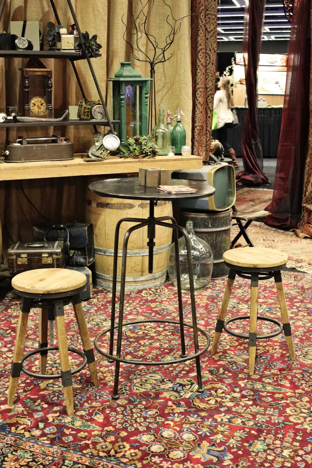 The PJ Hummel booth at the 2013 Northwest Event Show had two different sides and themes. First, we had Steam Punk! With a base of burlap drapery, Vintage tan Persian rugs and market lights. Our sign was built on old pallets that supported a ladder with metal letters. We showcased lots of new inventory including industrial metal cocktail tables (no linens required!) and matching industrial wooden stools, an industrial factory cart table, spotlight lamps, the clock collection…. And a antique pony! The entire booth was filled with our extensive vintage collection to further the Steam Punk theme!